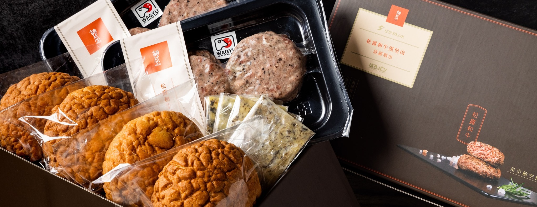 星宇限定版「松露和牛漢堡肉菠蘿包」組合陣容豪華,由知名品牌菠蘿麵包 ぼろパン BOLO PAN打造冰火菠蘿油,胡同嚴選日本知名宮崎牛,選用臀肉及腿肉部位,以肥瘦黃金比例 1:9 製成松露和牛漢堡排,香煎後放入鬆軟菠蘿麵包再鋪上特製松露奶油,大口咬下雙倍松露香氣隨肉汁盈滿口腔,搭配冰火菠蘿油的甜鹹滋味,豐富口感層次令人驚艷。另可依喜好個別品嚐冰火菠蘿油及和牛漢堡排,多種吃法樂趣十足,適合全家一起體驗「自煮」樂趣。