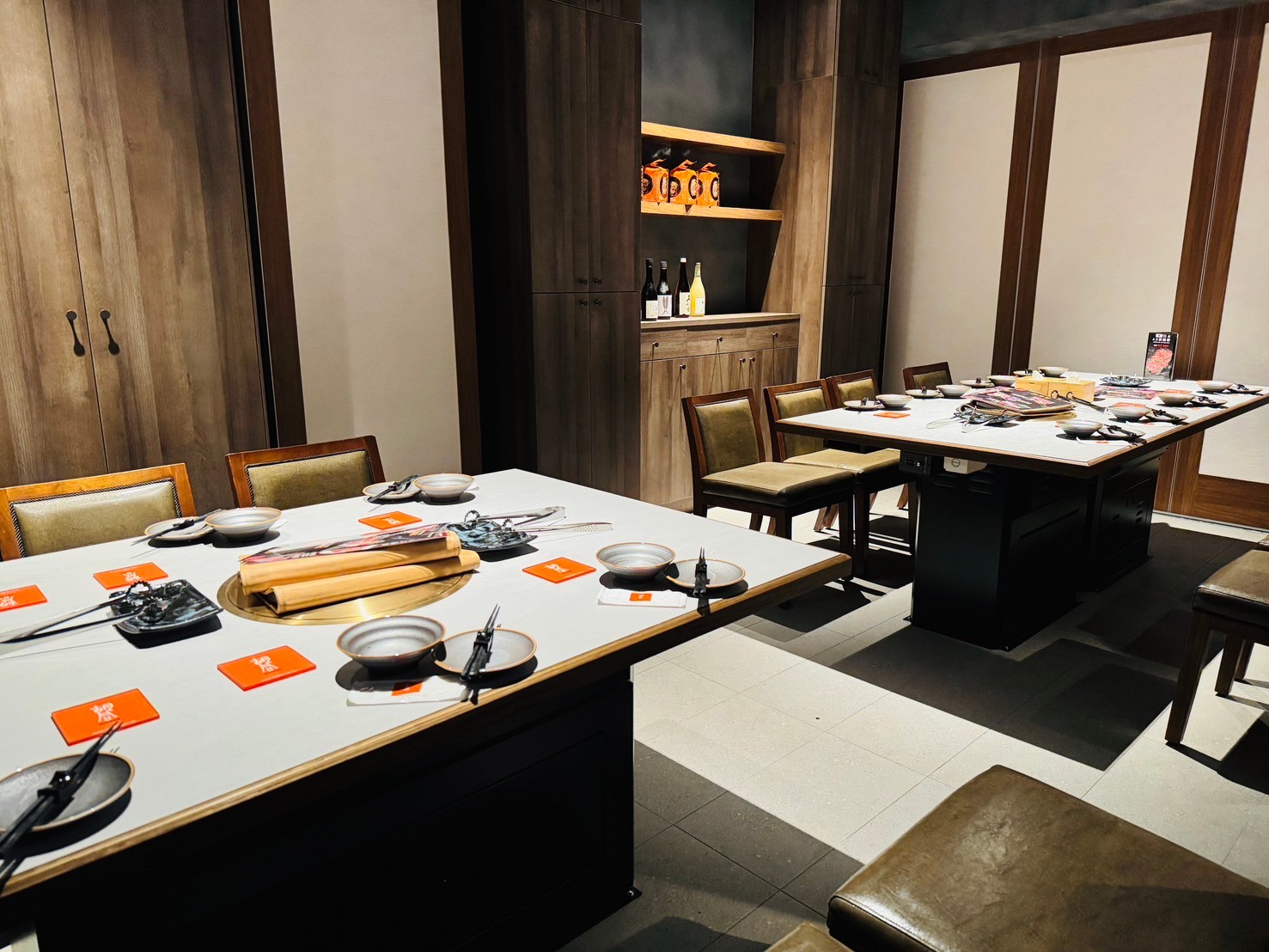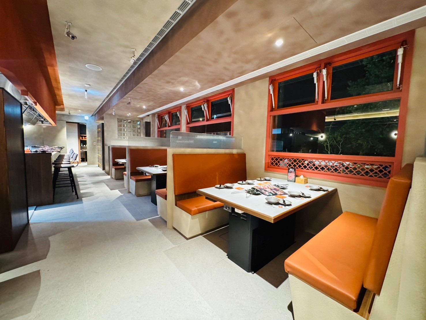 吧檯座位14位、4人桌2張、6人桌6張、 8人桌1張、包廂兩間(6人桌低消$15,000、8人桌低消$20,000,兩間可連通)